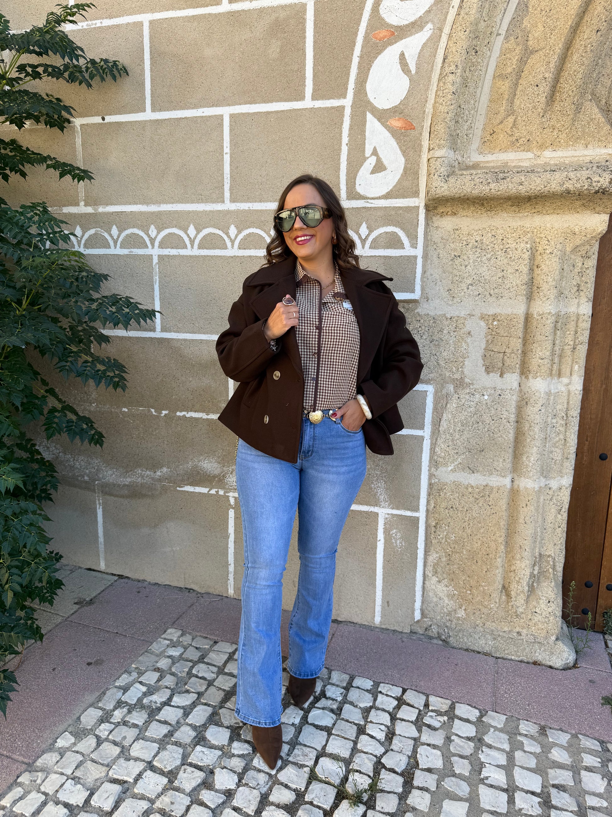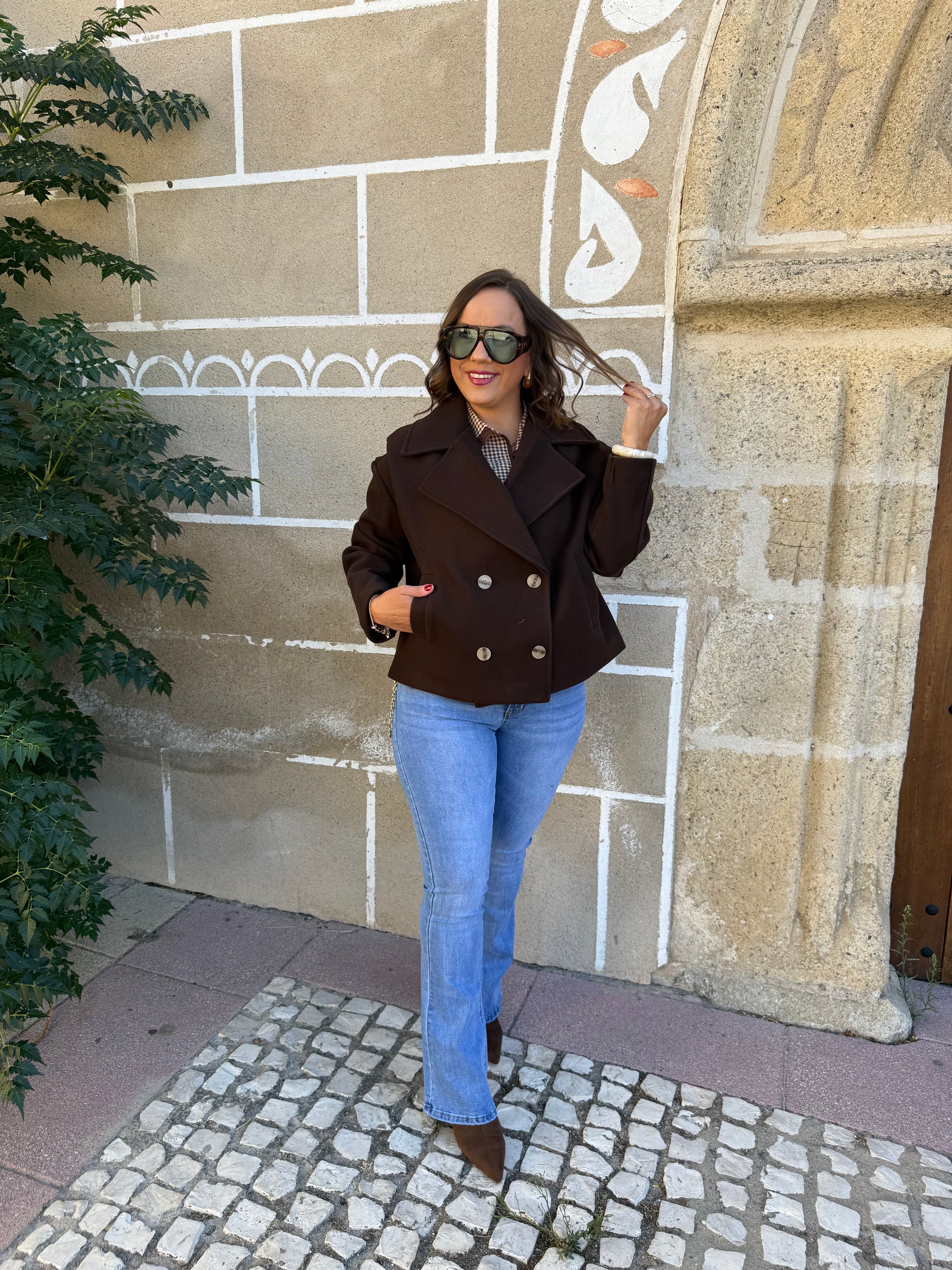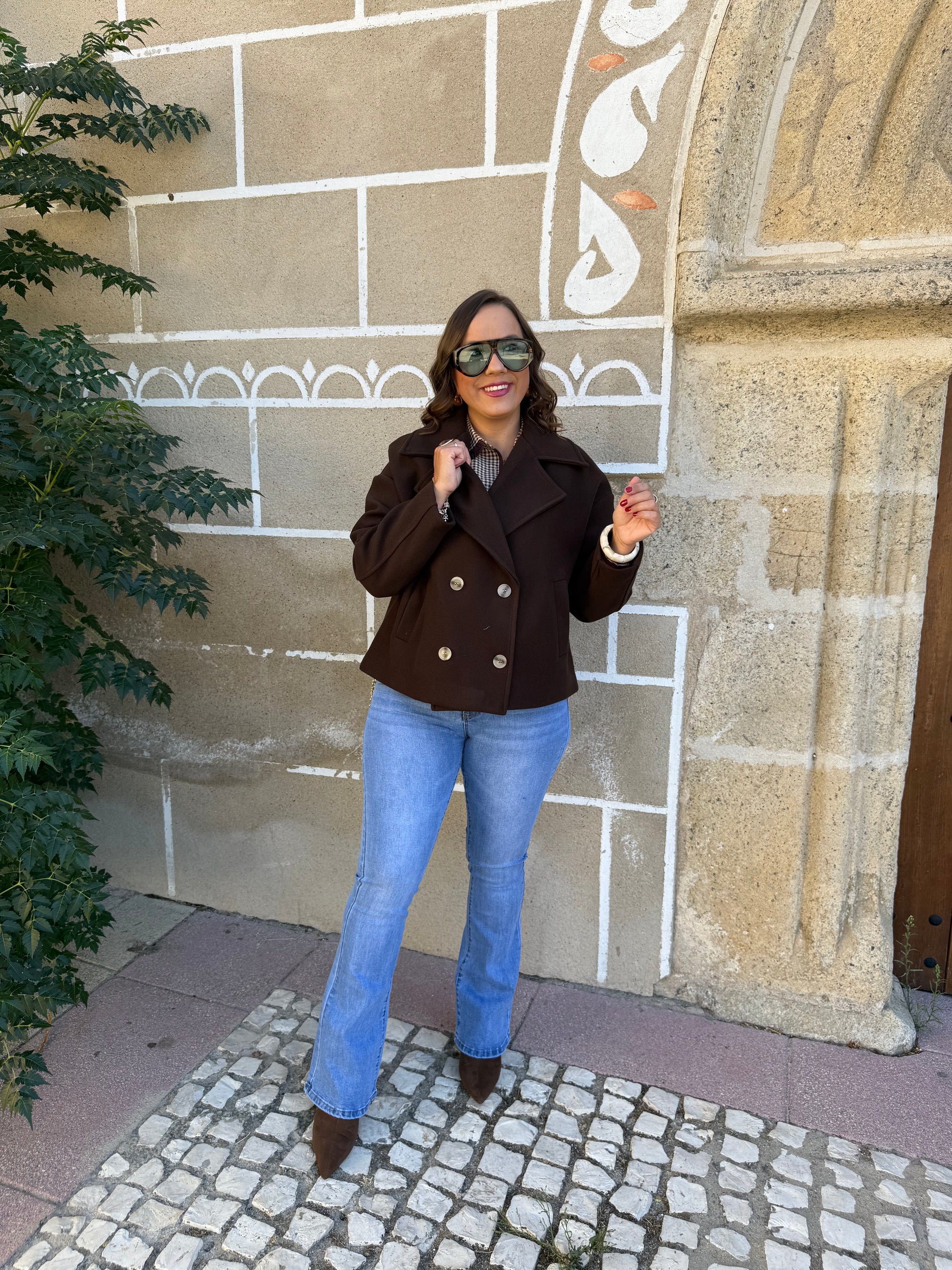 Abrigo corto de paño con botonadura cruzada y bolsillos laterales, manga oversize.