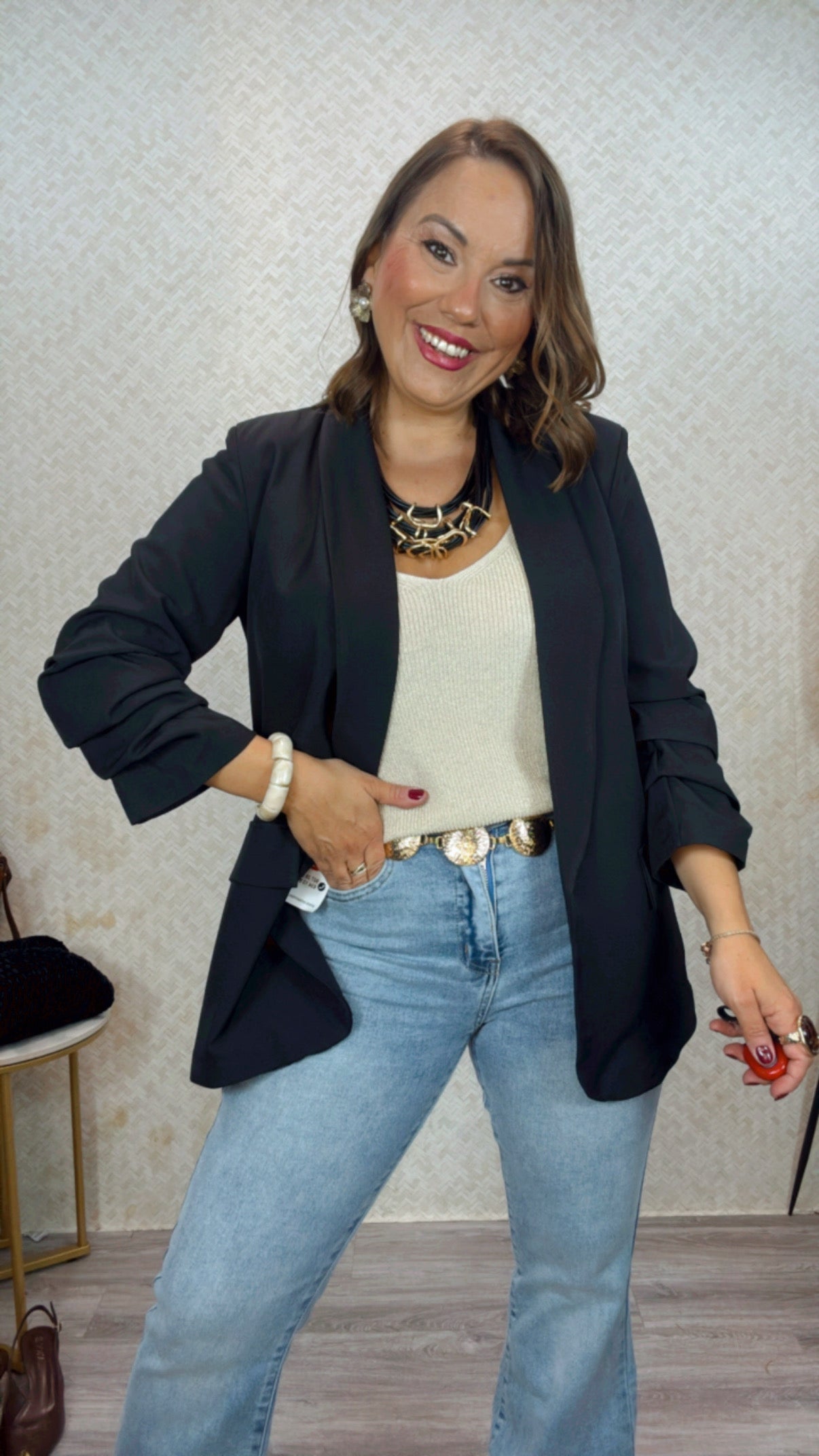 Americana con manga fruncida , abierta con solapa en la parte de alante, no lleva cierre.