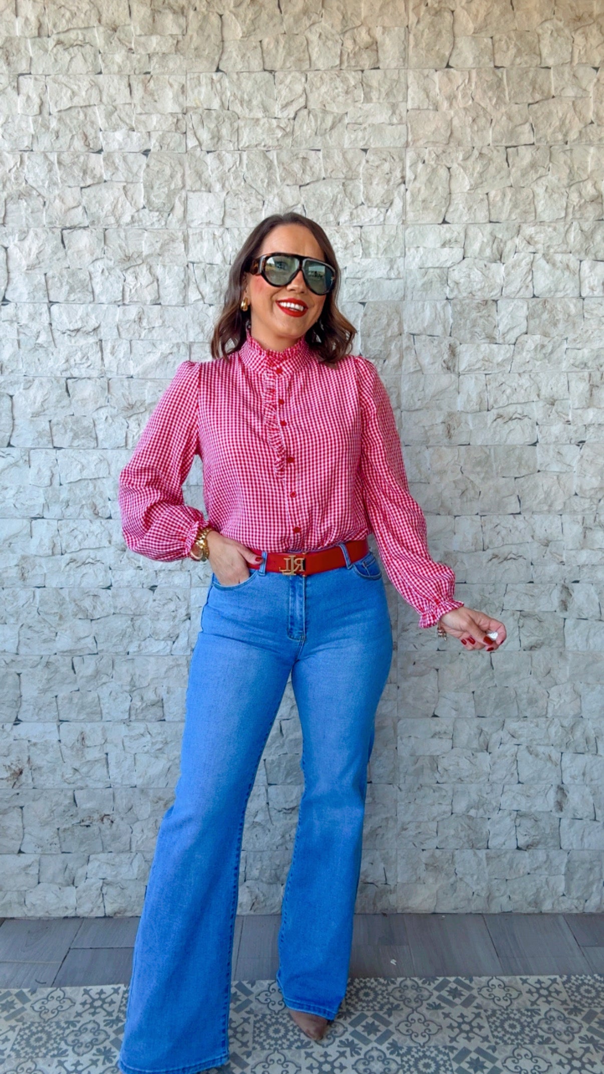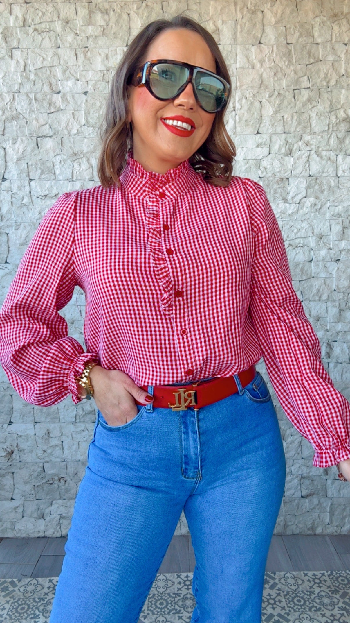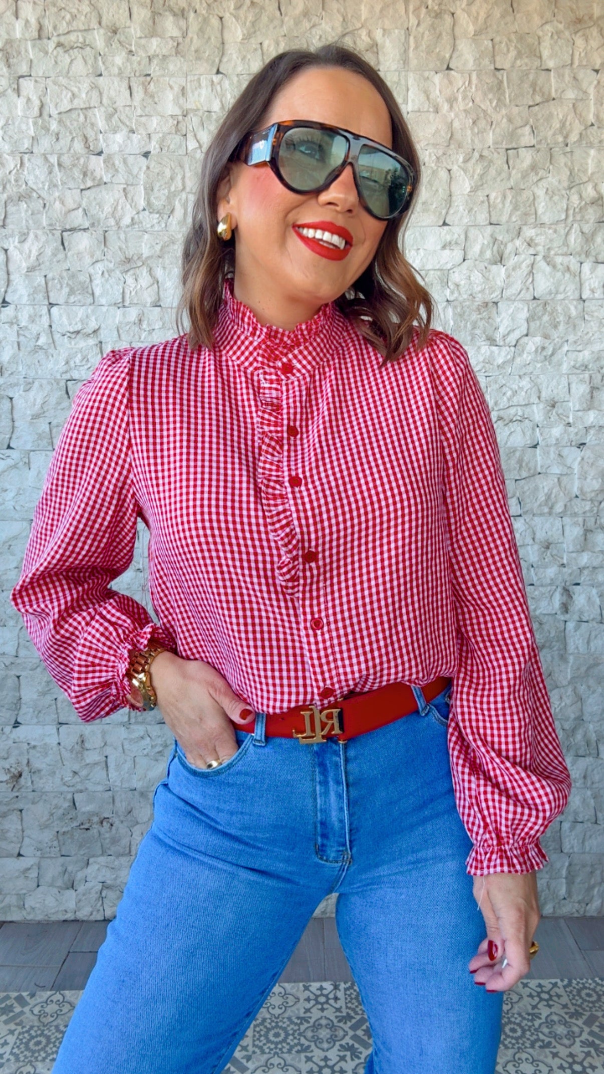 Camisa de cuadros Vicky roja, con detalle de solapa lateral con volante y cuello subido.