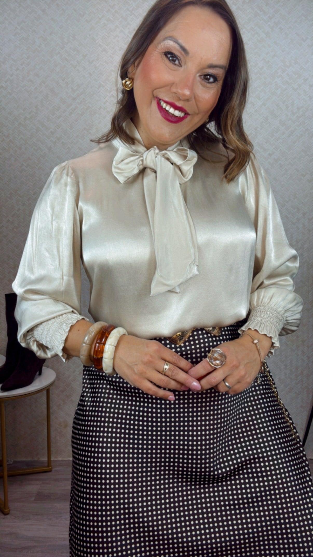 Camisa satinada con una gran calidad y caída manga fruncida en la parte del hombro y goma elástica en el puño detalle de nudo en la parte delantera con escote lágrima.