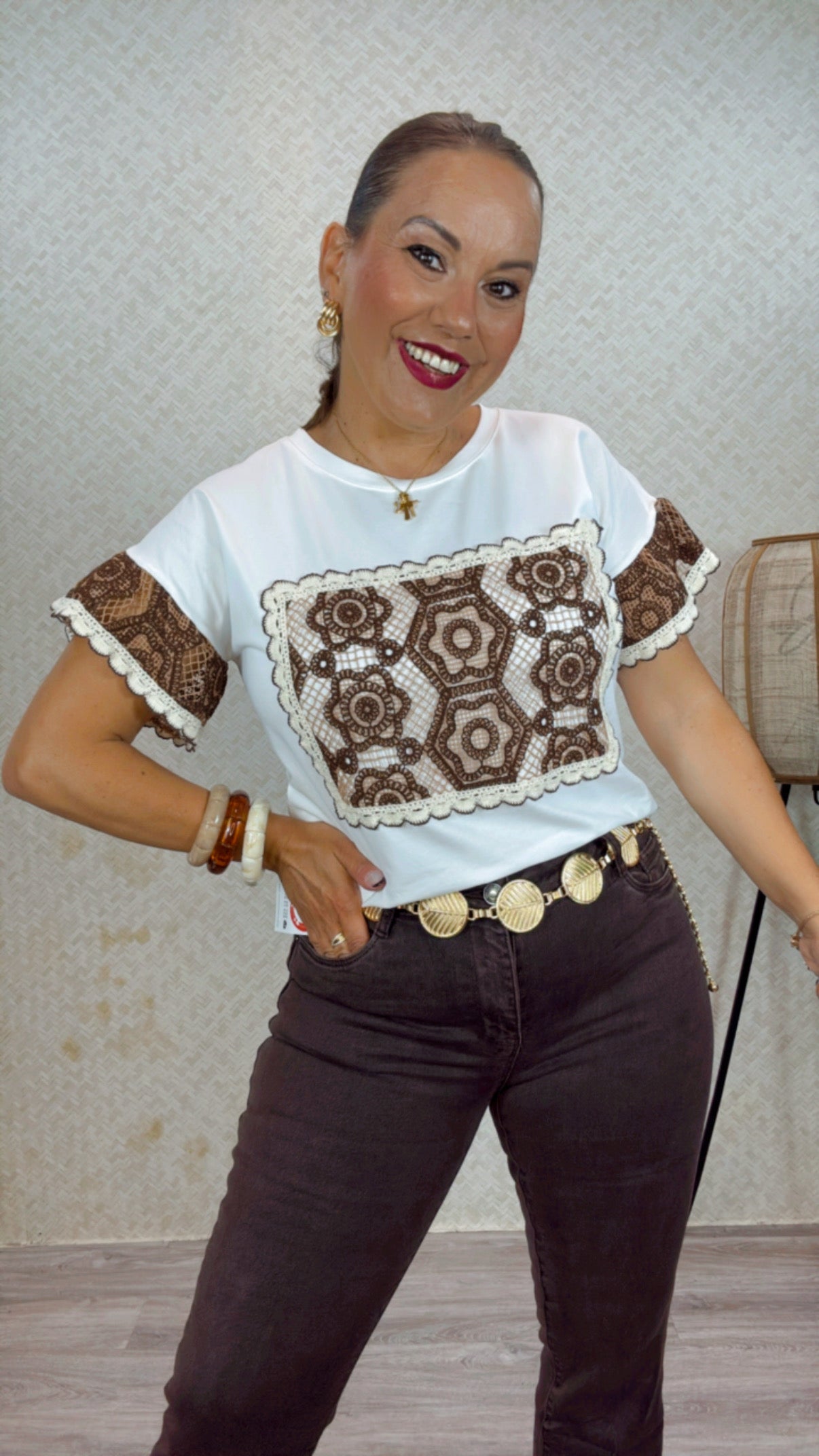 Camiseta de licra de manga corta con detalle de crochet marrón en la manga y parte delantera del pecho.