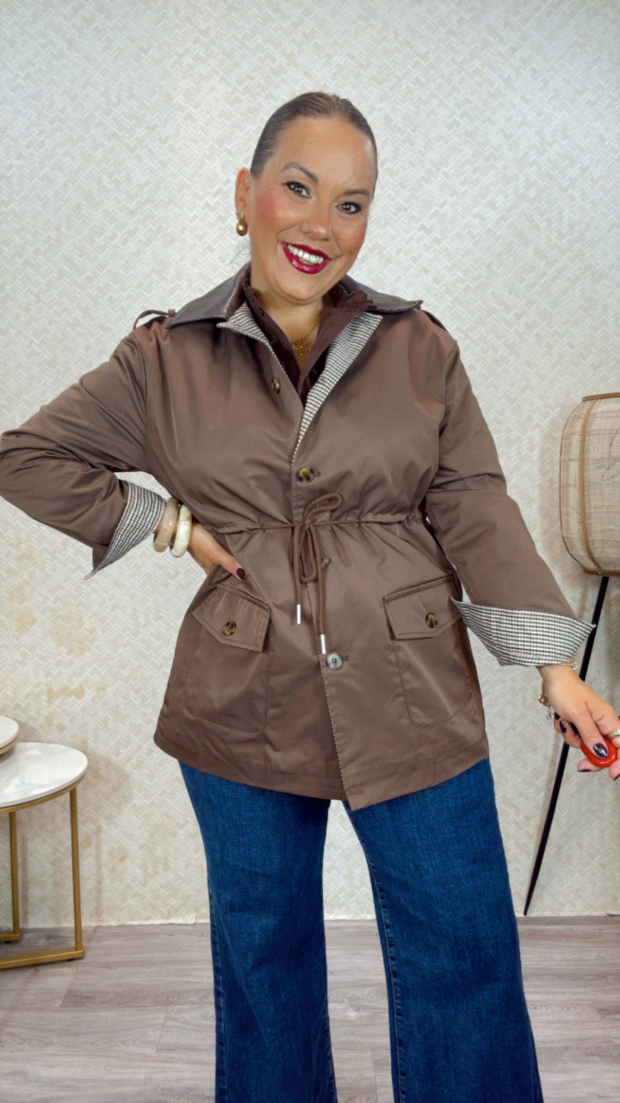 Cuello de pólipiel, toda forrada con detalle de forro en cuadro Vichy marrón y Camel.