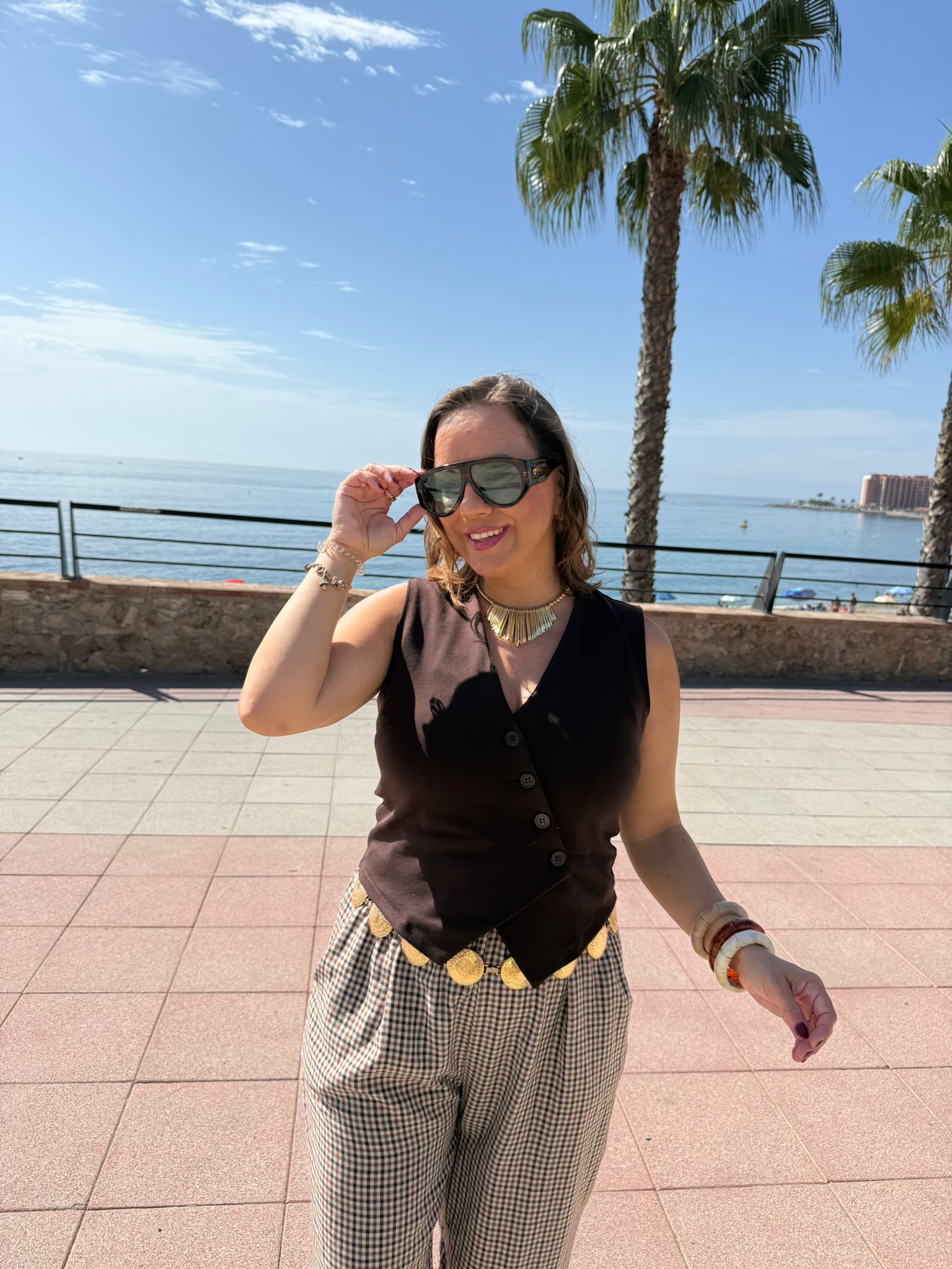 Chaleco Cruzado Abotonado , escote en pico acabado en apertura en la parte de alante.