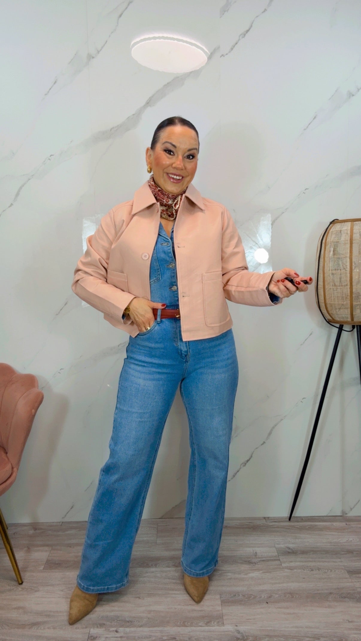 Chaqueta de poli piel en corte recto con cuello camisero, tres botones y detalles de dos máxi bolsillos en la parte delantera toda por dentro forrada.