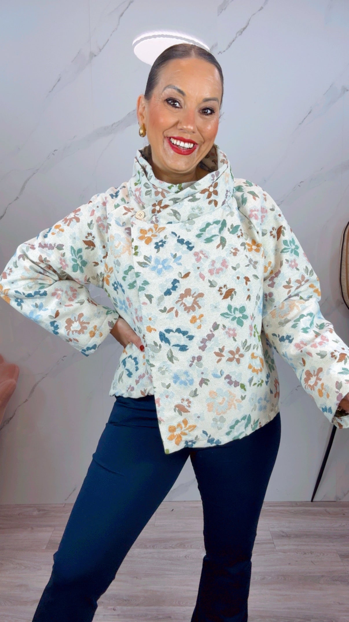 Chaqueta con corte cruzado con detalle de estampado floral. Cuello cruzado con botón