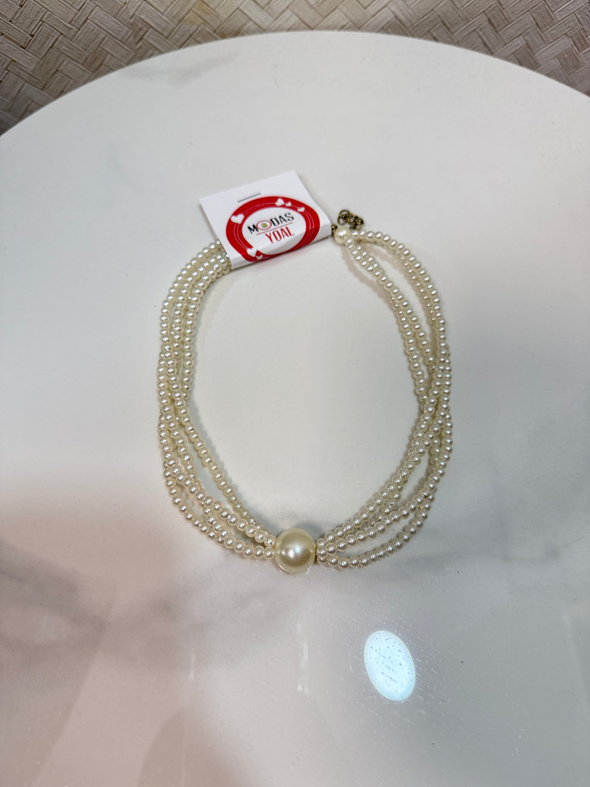 Colgante de triple cadena de perlas y perla cultiva en el medio grande.