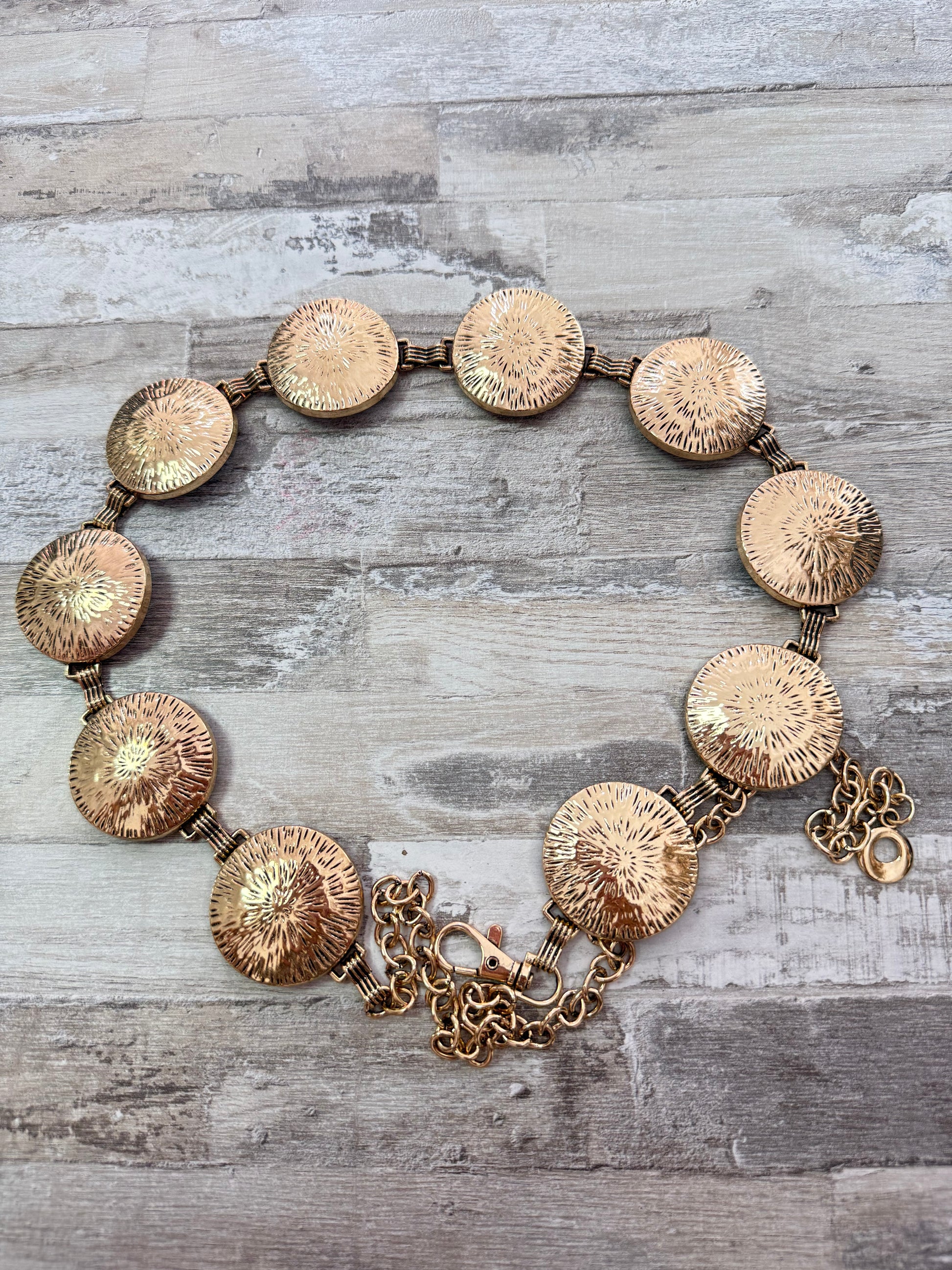Cinturón dorado labrado con dibujo en relieve, cadena ancha para ajustar a diferentes medidas.