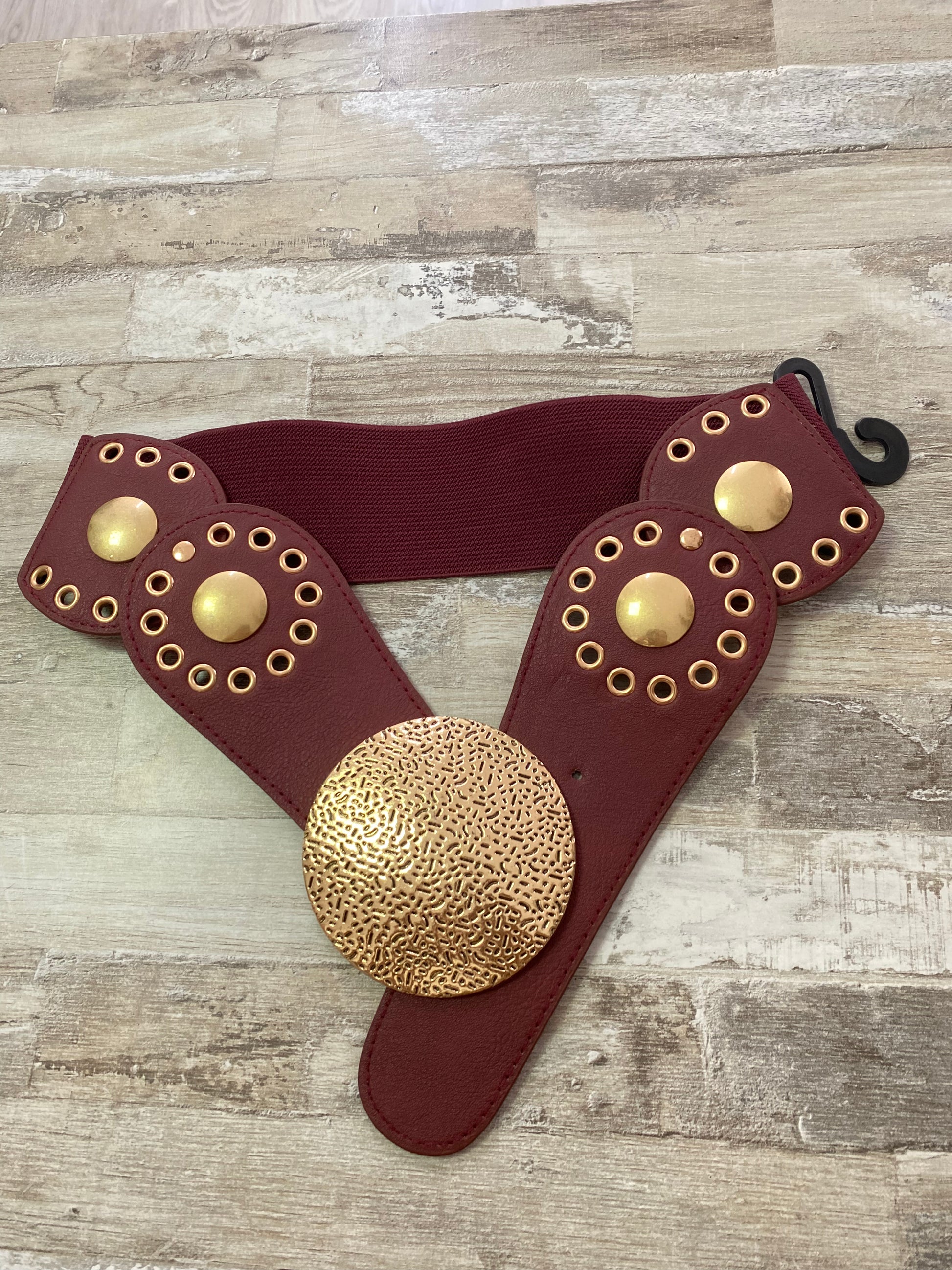 Cinturón con hebillas grande en dorado y con tachuelas y goma elástica que lo mismo que cede se adapta y es ajustable.