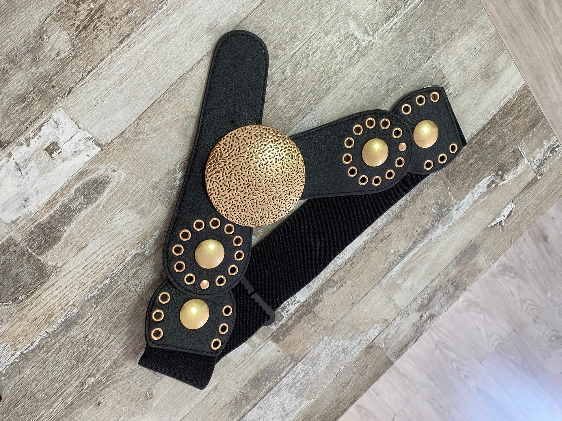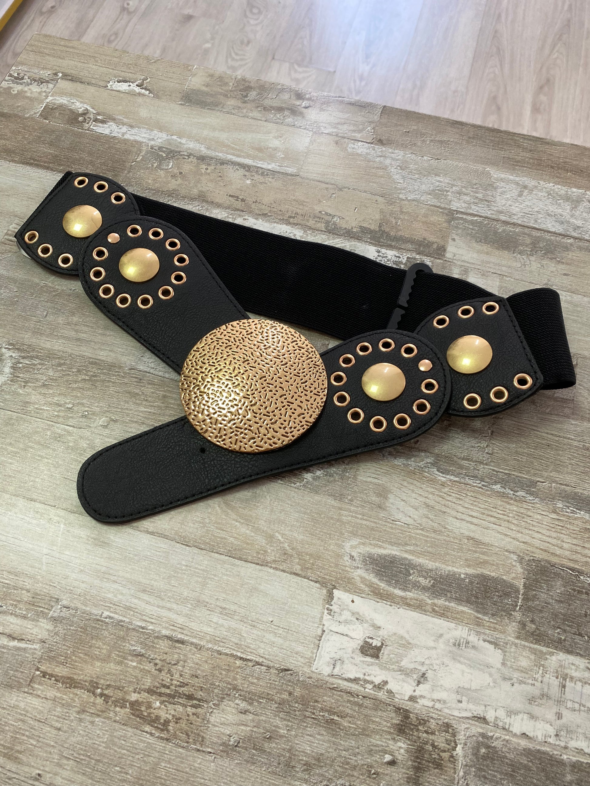 Cinturón con hebillas grande en dorado y con tachuelas y goma elástica que lo mismo que cede se adapta y es ajustable.
