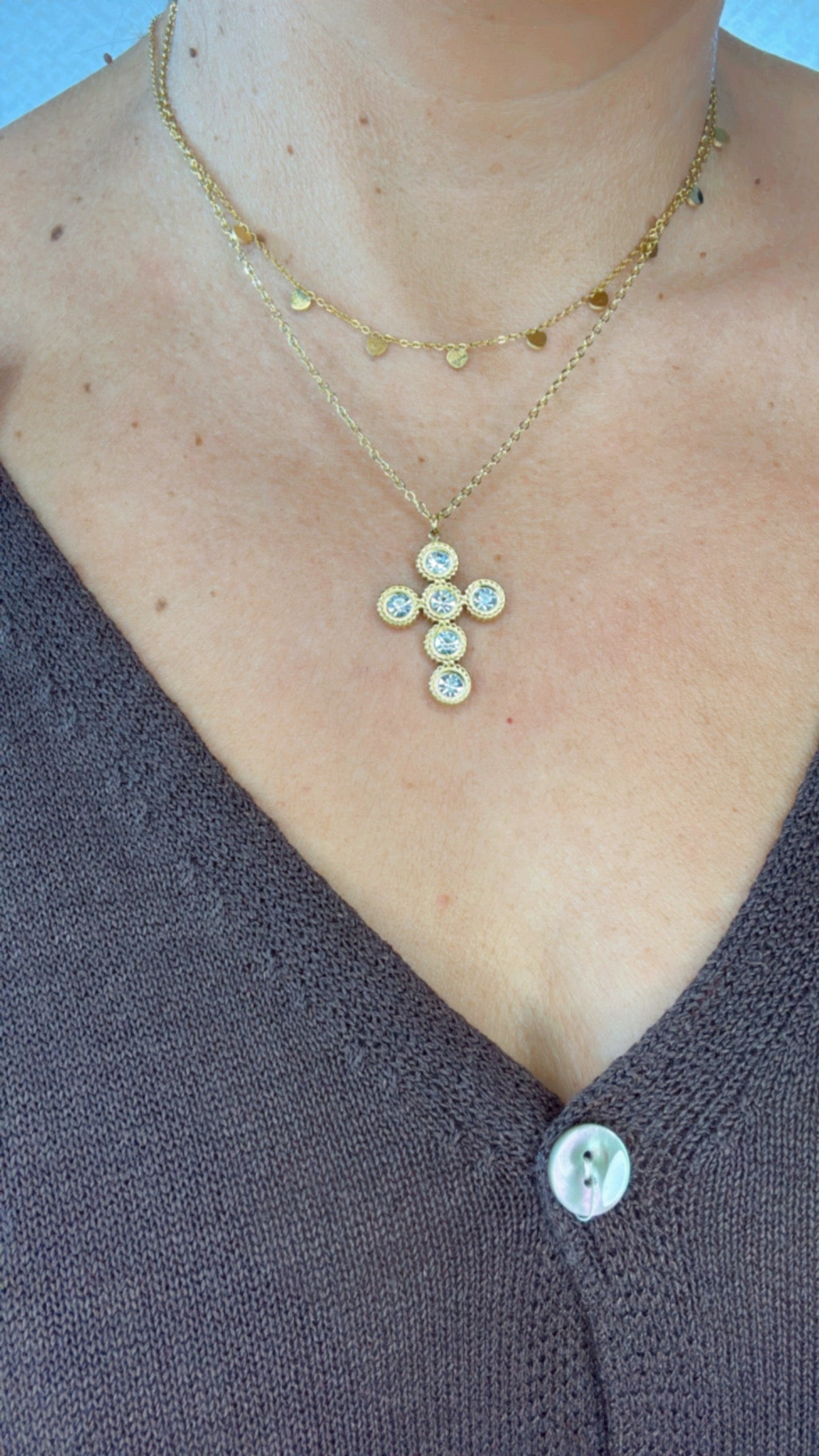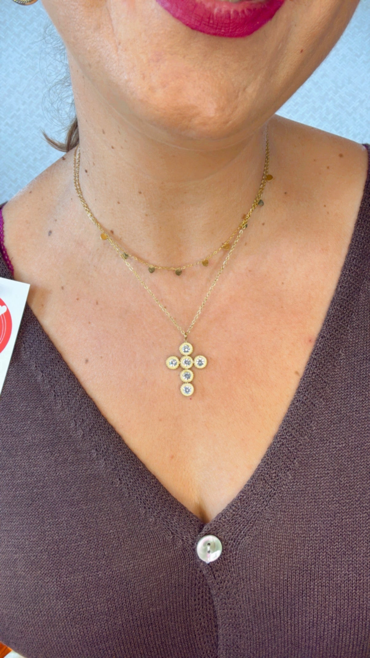 Colgante cruz de piedras en blanca, de acero antialérgico.
