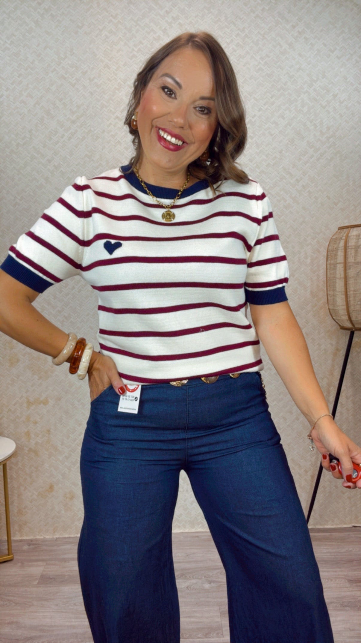 Jersey de punto con estampado de rayas con dibujo en la parte delantera, de manga corta , cuello redondo.