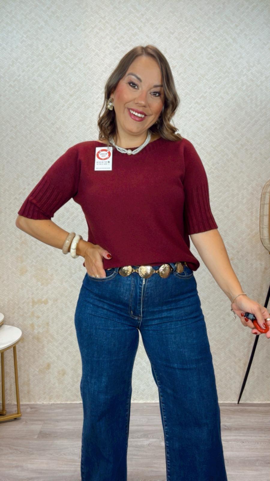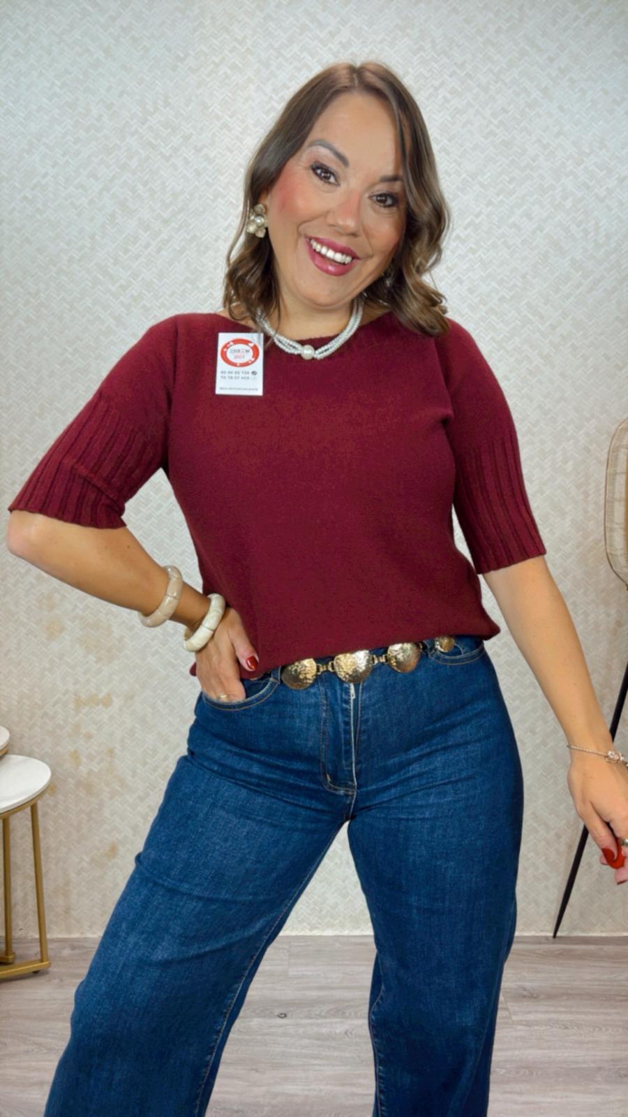 Jersey de punto con cuello redondo, y manga francesa , un punto que lo mismo que cede se adapta.
