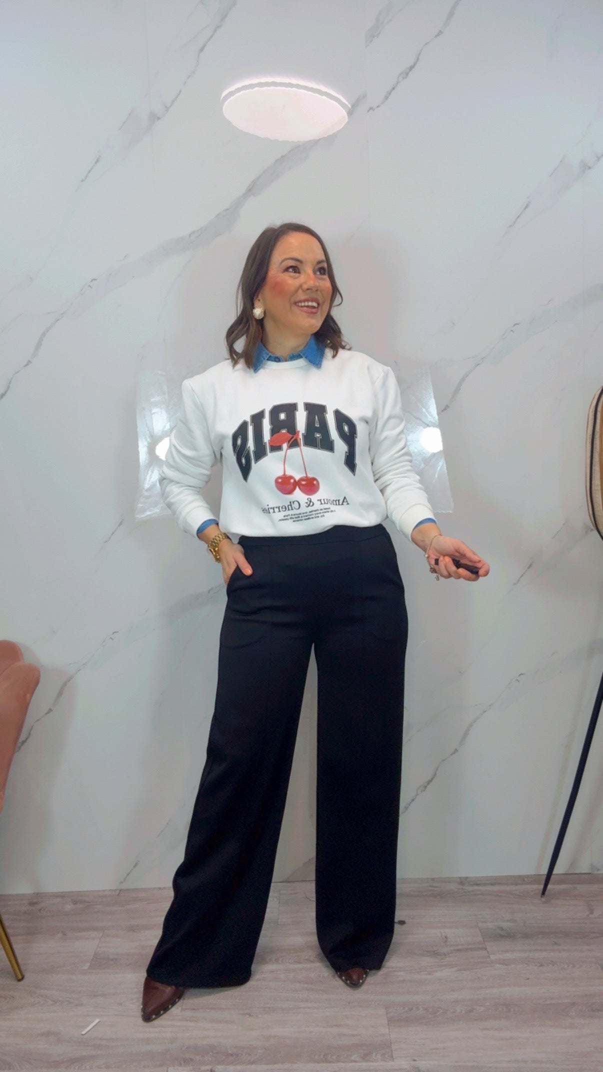 Pantalón fluido negro con detalles de cintura engomada y bolsillos, súper cómodo y muy fluido.