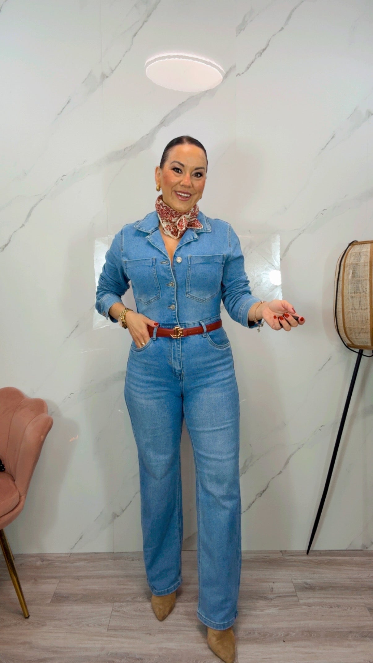 Peto enterizo con botones hasta el ombligo, corte en la cintura con botín y cremallera. Pierna recta.