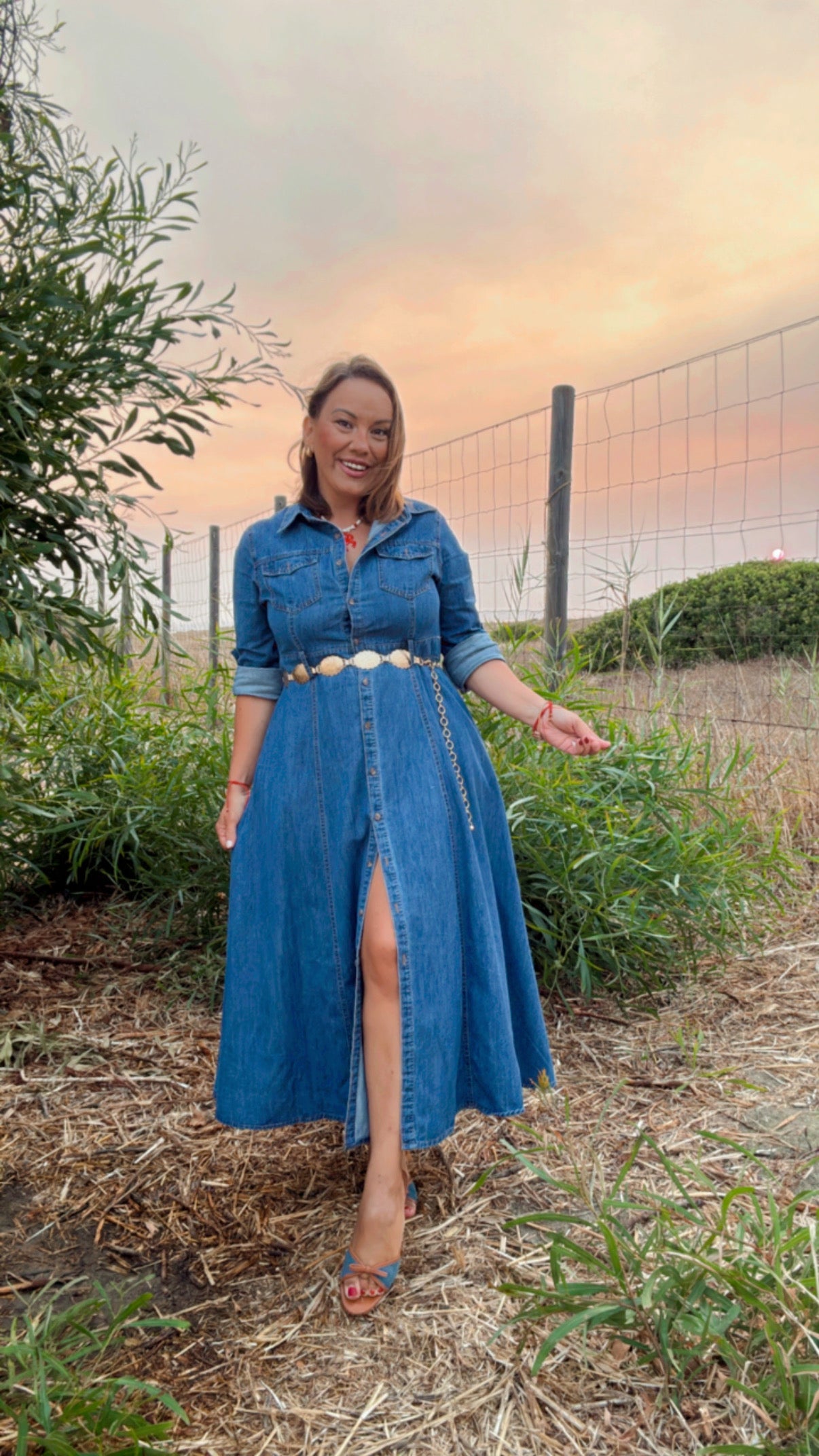 Vestido largo vaquero camisero con bolsillos, corte en la cintura y trabillas para cinturón.